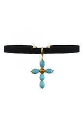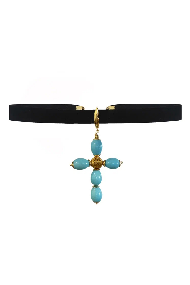 Чокер с крестом российского дизайнера LA FAMILY. Состав: керамика, латунь. Цвет: голубой. Уважаемые покупатели, возврат данного изделия возможен только в момент примерки курьеру при доставке. Оплаченный товар обмену и возврату не подлежит.